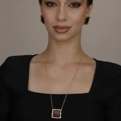 Conjunto Colar e Brinco Quadrado trabalhado em pedra acrílica